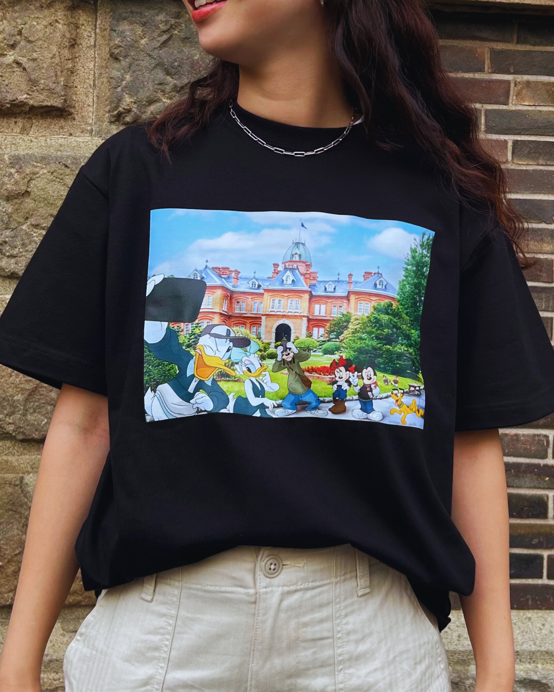 描かれているのは、赤れんがガーデンでミッキーやドナルドが仲良く“自撮り”している特別なシーン