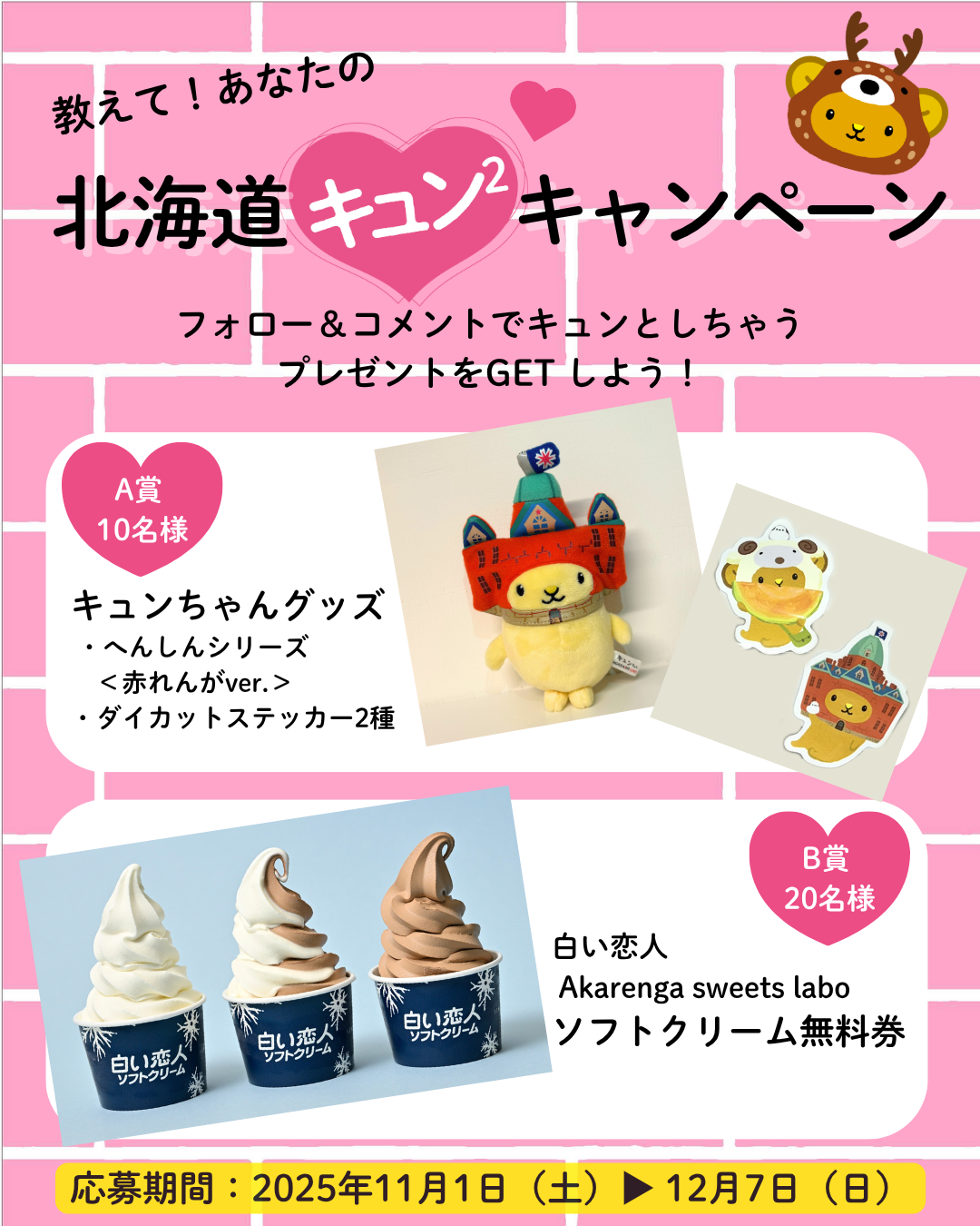 フォロー&コメントでキュンちゃんグッズや白い恋人 Akarenga sweets laboで使えるソフトクリーム無料券がもらえるお得なキャンペーンを開催します!