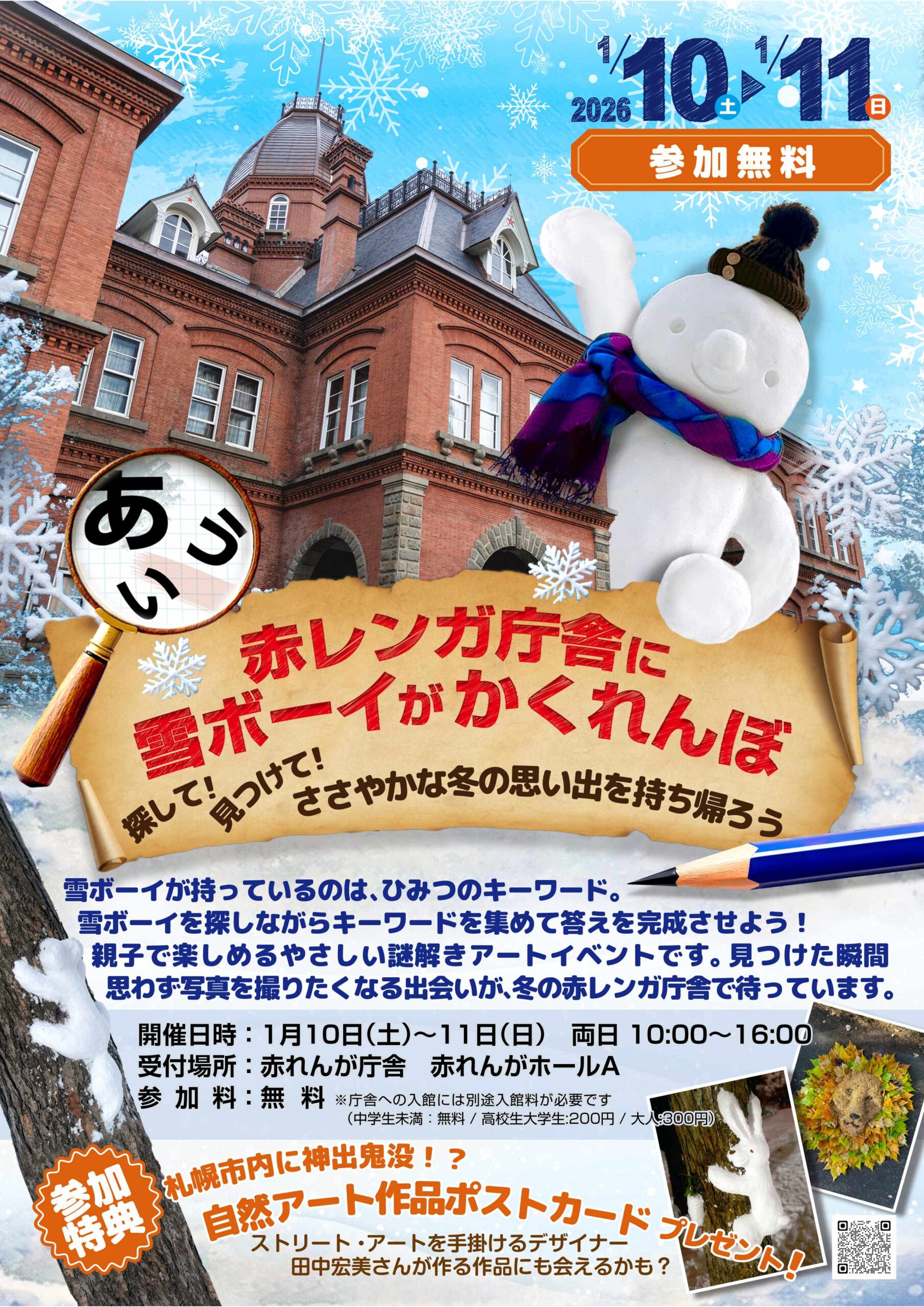 お知らせ お知らせ 2025/12/27 イベント 1/10~1/11 「赤レンガ庁舎に雪ボーイがかくれんぼ」開催! 2026年1/10(土)~11(日)の二日間、親子で楽しめる謎解きアートイベントを開催いたします。 参加は無料!ぜひご参加下さい! 最新の記事はこちら 2025/12/27 イベント 【再掲】南北出入口封鎖のお知らせ 2025/12/27 イベント 赤煉瓦おみくじ 1月4日から! 2025/12/27 イベント 1/10~1/11 「赤レンガ庁舎に雪ボーイがかくれんぼ」開催! 2025/12/26 その他 南北出入口封鎖のお知らせ 2025/12/22 イベント 年末年始 休館日のお知らせ お知らせ一覧に戻る