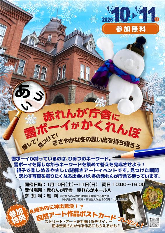 お知らせ お知らせ 2025/12/27 イベント 1/10~1/11 「赤れんが庁舎に雪ボーイがかくれんぼ」開催! 2026年1/10(土)~11(日)の二日間、親子で楽しめる謎解きアートイベントを開催いたします。 参加は無料!ぜひご参加下さい! 最新の記事はこちら 2026/02/19 イベント お得に遊べる!恋するさっぽろパス スタート 2026/02/13 イベント 【プレゼント】赤れんが庁舎オリジナルステッカー 2/14(土)から! 2026/02/06 イベント 赤れんがでバレンタイン❤お菓子つかみどりフェス 2/13~2/15 2026/01/30 イベント 歴史文化と光が彩る、雪まつり期間の赤れんが庁舎~昼は日本文化体験、夜はスノーキャンドル~ 2026/01/16 イベント 1日1組限定「赤れんが地下特別個室プラン」予約受付中 お知らせ一覧に戻る
